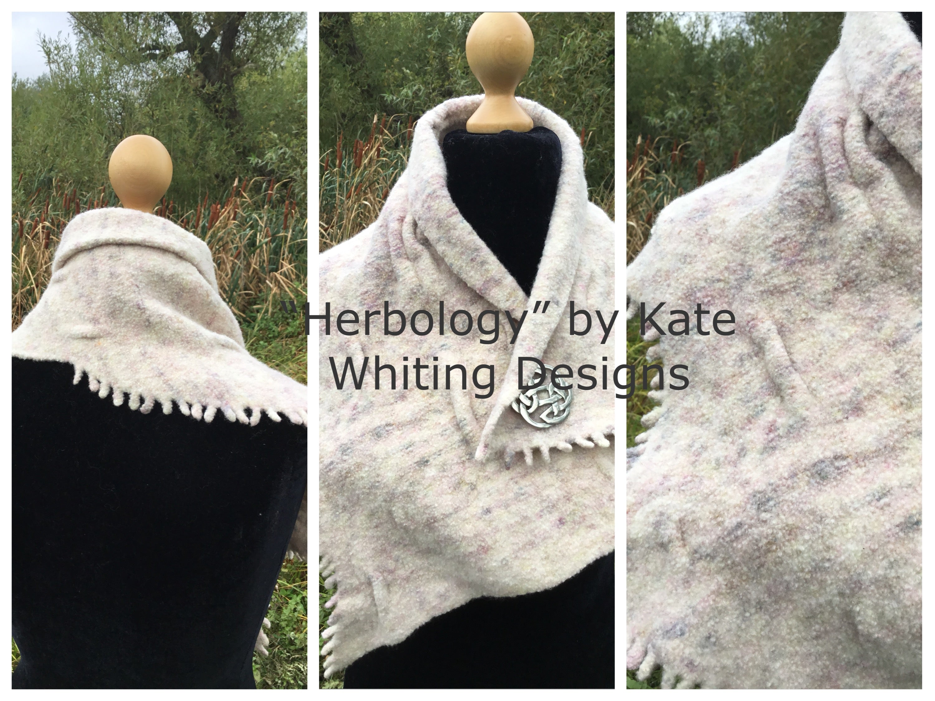 This design is knitted and then felted to create a shawl that’s inspired by clothing in the 1800s, when for the poorer women of the time, a rustic, warm felted shawl around their shoulders would have been a necessity. Those worn by the slightly wealthier would have been embroidered to add detail and further texture.