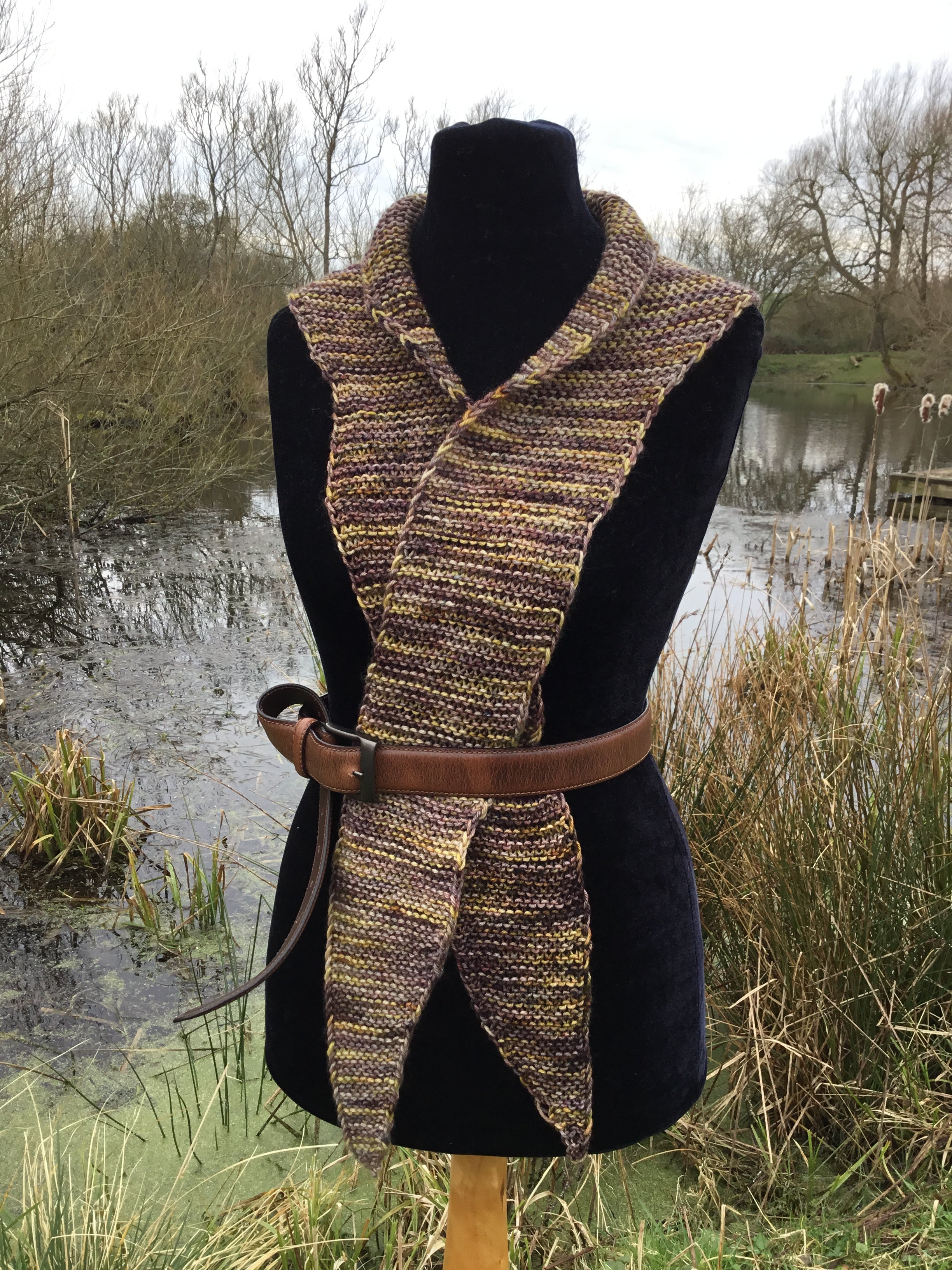 Its created holding two strands of DK weight yarn together and with the shaping I have given it, allows you to make a perfect sized neck and shoulder shawl. The stitches create an interesting texture to the piece that’s thick and warm.